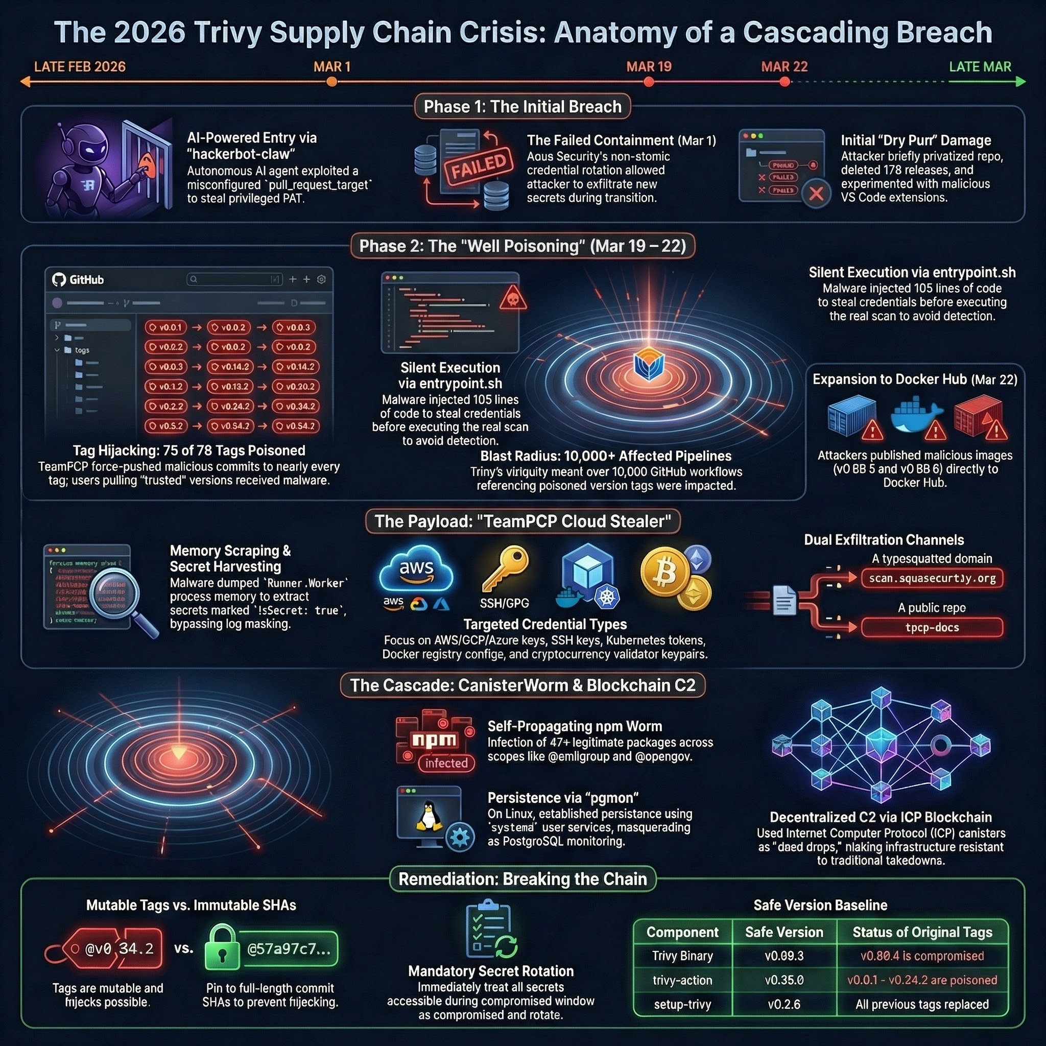 In March 2026, attackers turned Aqua Security’s Trivy ecosystem into a credential-harvesting distribution channel. This was not one bug, one poisoned package, or one bad release. It was a chained failure across GitHub Actions trust, secret rotation, mutable tags, runner memory, registry publishing, and npm’s default willingness to execute third-party code.